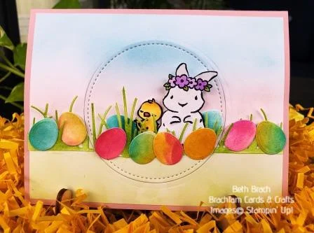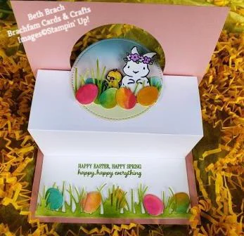 The background was made using the Blending Brushes with Granny Apple Green, Blushing Bride and Seaside Spray ink. On a scrap of white cardstock I blended various colors (Bermuda Bay, Magenta Madness and Mango Melody) and then die cut the eggs from the Wreath Builder dies. The grass is from the Friendly Silhouettes dies with the cattails cut off and the grass trimmed down a bit. The cute bunny and chick from the Springtime Joy stamp set were colored with Stampin’ Blends and fussy cut. Of course the eggs have a touch of Wink of Stella and the bunny is coated with Shimmery Crystal Effects. Look what happens when you open it up!