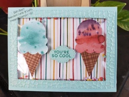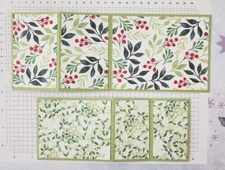 Then pick a 2 coordinating Designer Series papers. Cut the first pattern: 1 piece at 4” x 5 ¼” and 2 pieces at 2 ½” x 4”. Adhere to the large piece of cardstock. Cut the second pattern: 1 piece at 3 ¼” x 4” and 2 at 1 7/8” x 3 ¼”. Adhere these to the smaller piece of cardstock.