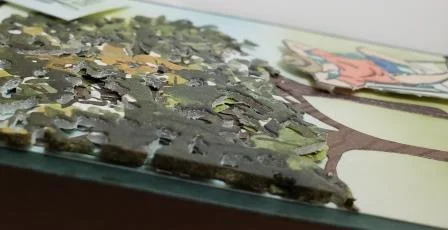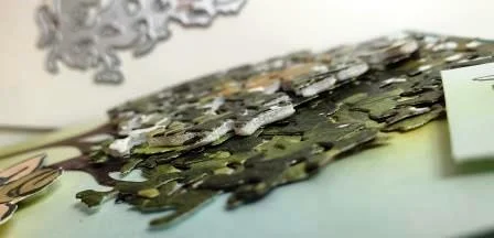 Fold cardstock along score lines. Adhere the smaller piece of cardstock on top of the larger piece. Tip: Apply adhesive to the right side of the smaller layer and position it on the right side of the larger layer. Apply adhesive to the left side of the small layer then fold card together.