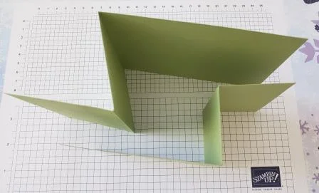 Start by cutting 2 pieces of cardstock 1 at 4 ¼” x 11” scored at 2 ¾” & 5 ½” and the other at 3 ½” x 8 ½” scored at 2 1/8” x 4 ¼”. Fold each piece of cardstock along the score lines.